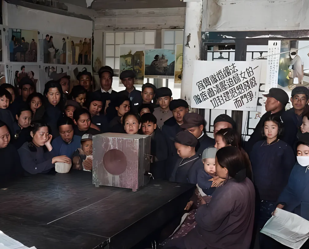 屋里挤满了人,桌上摆着一只铁皮喇叭,边角起了锈,声音从那圆孔里往外冒,大家不约而同地把身子探过去,孩子趴在大人胳膊上,小手拍着桌沿,一下一下的,像打拍子。