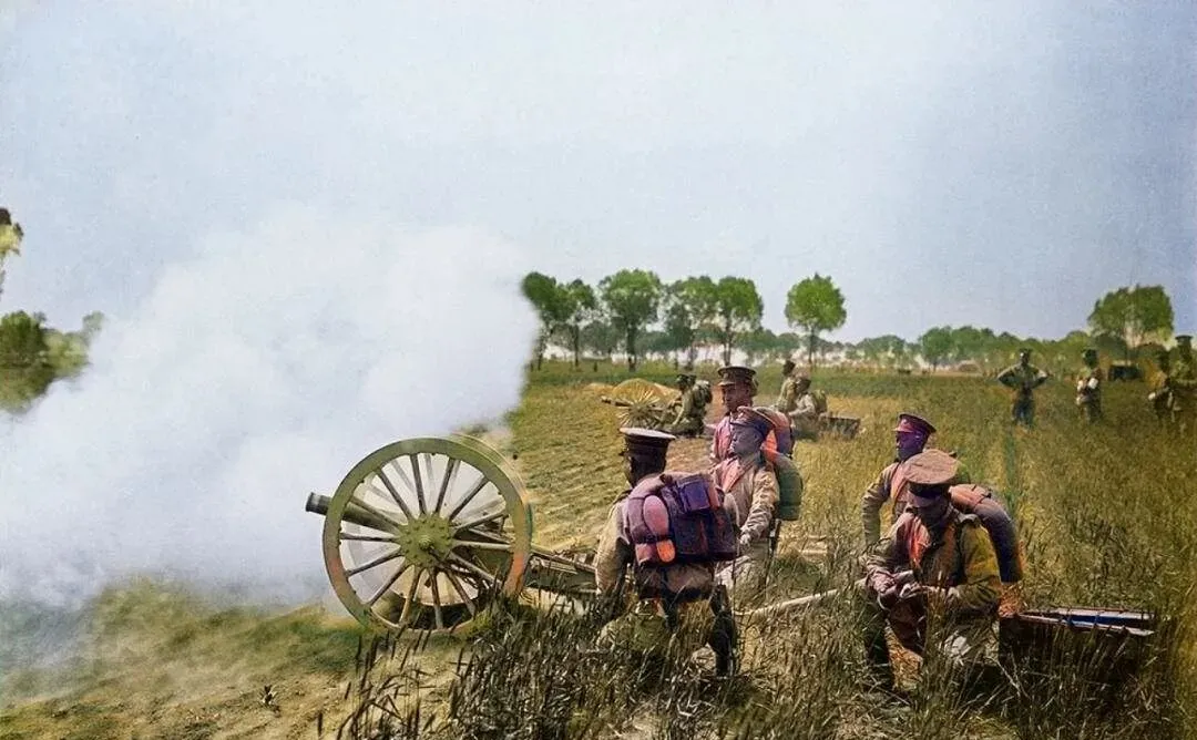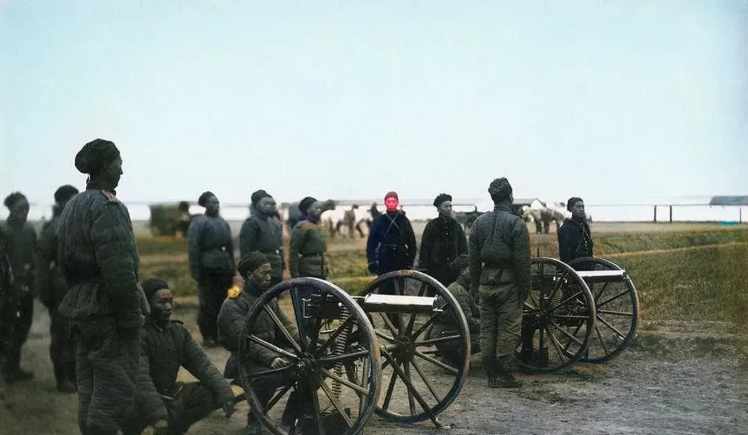 图中这门黑亮的铁疙瘩叫马克沁快炮,两侧高轮子木辐子密密扎实,炮身卧在车架里,前头一个横着的白木板是瞄准与装具的台面,士兵围着它蹲着站着,手里捏着拉绳,眼睛跟鹰一样尖,听老人讲,练打靶时先校距后归零,口令一下,拉绳一抖,火舌吐出来,可真是吓人一跳。