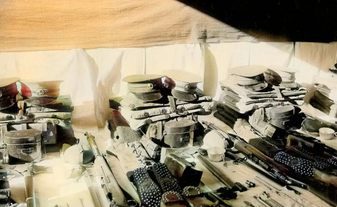 这一桌子的细软叫军械清点,军帽叠得像豆腐块,腰带卷得圆溜溜,枪机拆开摆成一条线,饭盒水壶缝衣包都归了类,阳光一照,金属边闪着亮,管库房的老兵最唠叨,缺一件罚一人,以前啥都匮乏,物件能顶命,哪敢糟蹋。