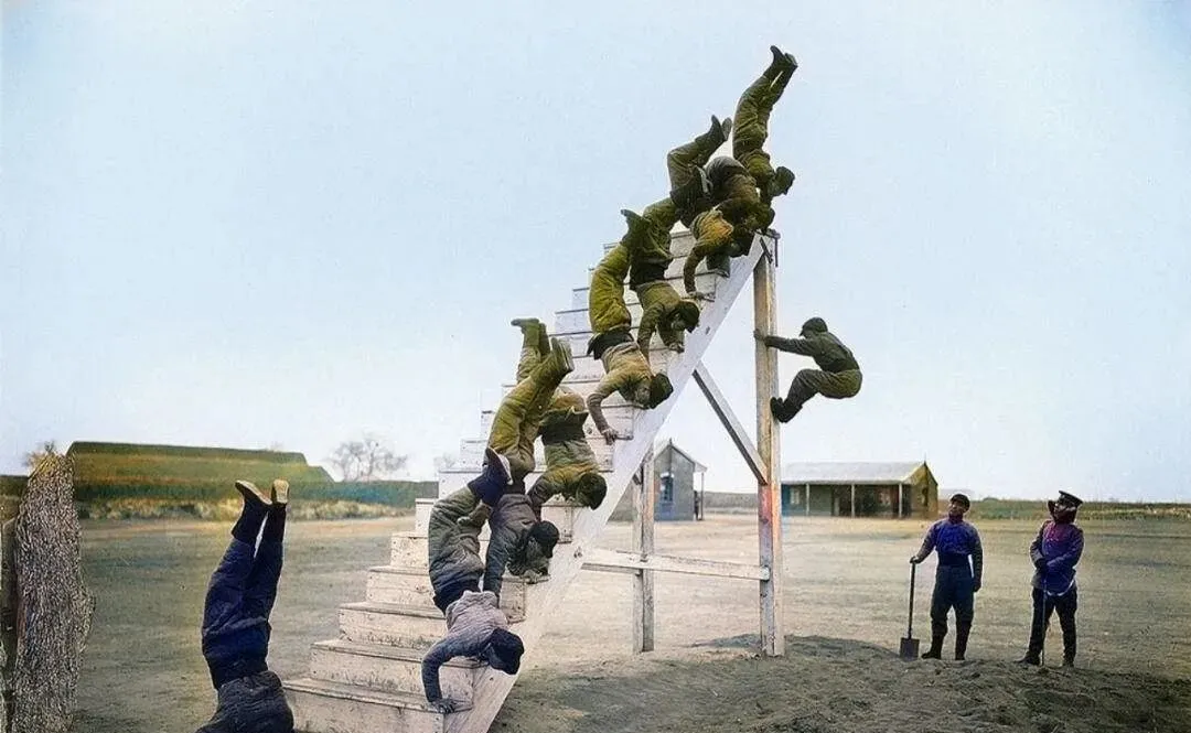 这梯子一样的木台子用来做器械体操,兵们像一串豆子滚上去再翻下来,正手反手都得过一遍,旁边两位教练拿着铁锹和小记本看得紧,谁掉拍谁挨训,这玩意儿不花哨,练的是肩肘腕的硬功夫,打仗真跑起来,越野翻障碍才不掉链子。