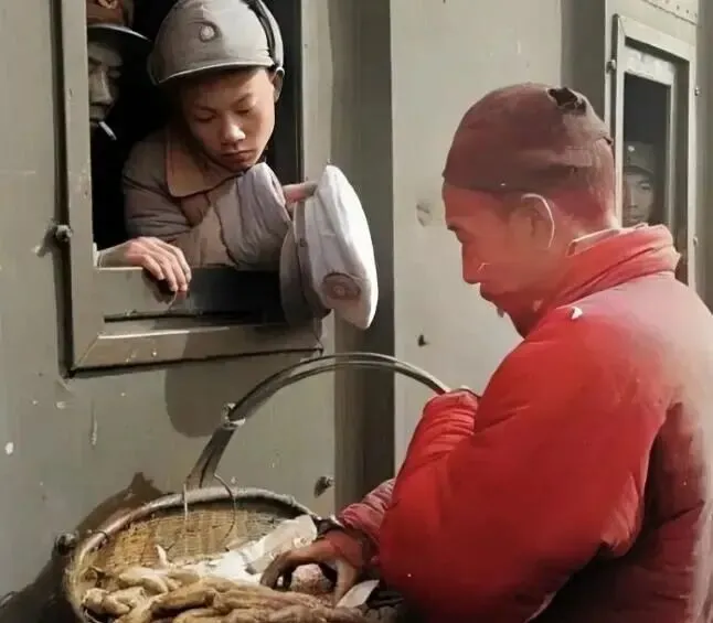 这张照片拍摄于40年代,一名卖油条的小商贩站在列车前卖食物。两名国军士兵在问价格,虽然衣服整齐,但从他们的脸上,依然能看出败退后的落寞和无奈。