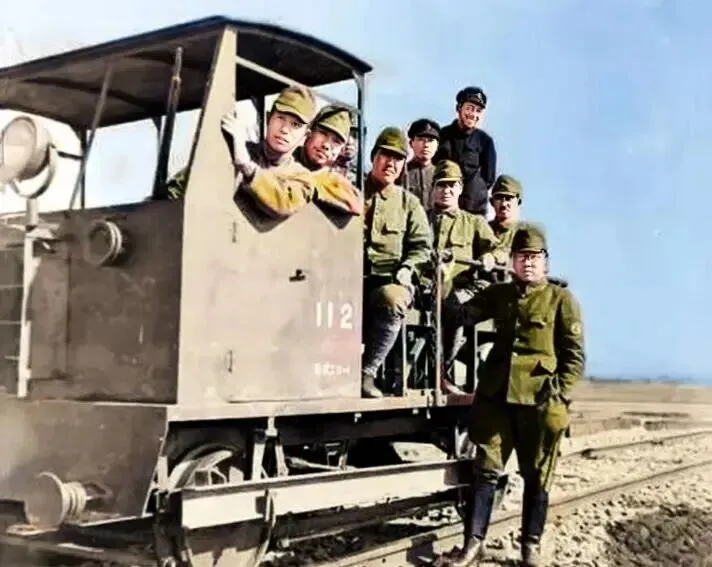 随行人员也不少,一个小小的火车头就承载了九个人的重量。照片里,他们看起来悠闲,其实所有脏活累活早就都甩给了中国人做。