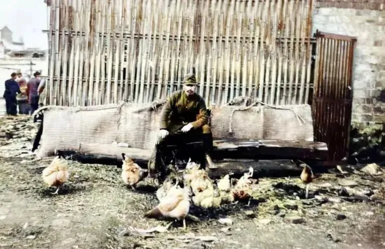 这名日寇在村子里搜刮了许多活鸡,他坐在百姓的鸡笼前,摆出一副高傲的姿态,用“胜利者”的眼神盯着镜头拍照。