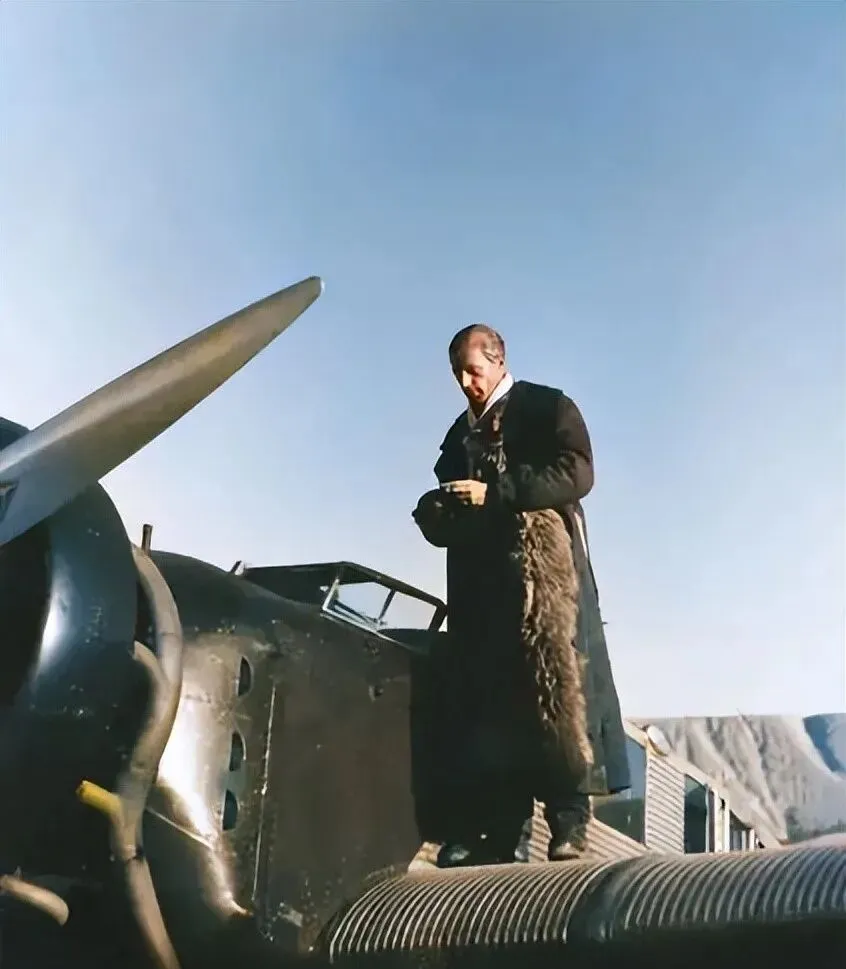 图中这位穿长皮大衣的人,手里攥着相机,站在发动机旁边的波纹机翼上,黑亮的螺旋桨斜着插进蓝天里,冷是冷的样子,阳光却晒得金灿灿,妈妈看见这张说了一句,那个年代谁家能离飞机这么近呀,我们小时候见到直升机都追出去看半天呢,这画面一下把“远方”的门给推开了。