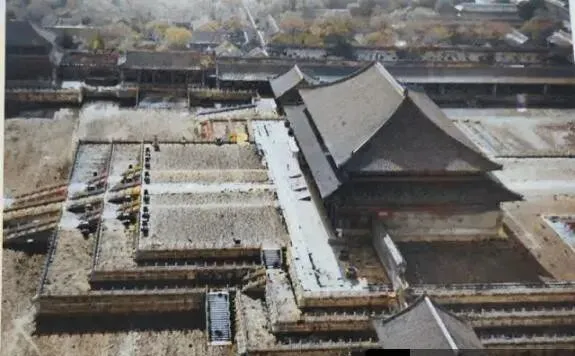 这块方台和大殿的组合叫宫城一角,灰黄的台基压得很稳,屋脊挑着兽头,檐下阴影一层一层,台阶中间像有条白缎子,往上直铺到门口,照片里能看见木料堆得方方正正,像在修缮的当口,老师傅一榫一卯地对齐,锤子轻轻一点,木头“笃”的一声,干脆,老屋子的大气就是这么扣出来的。