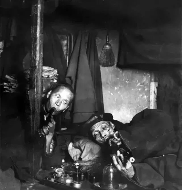 两位大烟鬼,整个人脸色透着青光,萎靡不振。烟具一整套,抽大烟也讲究起来。烟枪,烟灯,烟签子。鸦片泛滥成灾,国人的体质也是到了几乎崩溃的边缘。历史上咸丰皇帝就是个烟鬼,他称鸦片为“益寿如意膏”,统治者都欲罢不能。