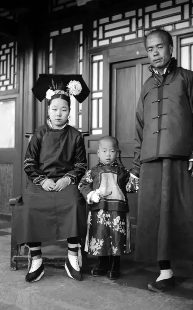 旗人的三口之家,衣着打扮看出家境殷实。女子面容姣好;丈夫也是神采奕奕;中间是他们的宝贝儿子,衣锦华服。满族女子是不用裹脚的,单凭这一点,就比汉族女子幸福。