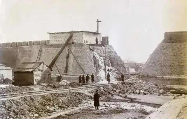 八国联军侵华,北京的古城墙遭到炮火,为了方便物资运输。当时的法军直接将城墙挖开,然后铺上铁轨,哪还有皇城的半点威严?紫禁城的留守太监,跪在地上低头耷脑,一点威风都没有了,身后站着英属印度兵。