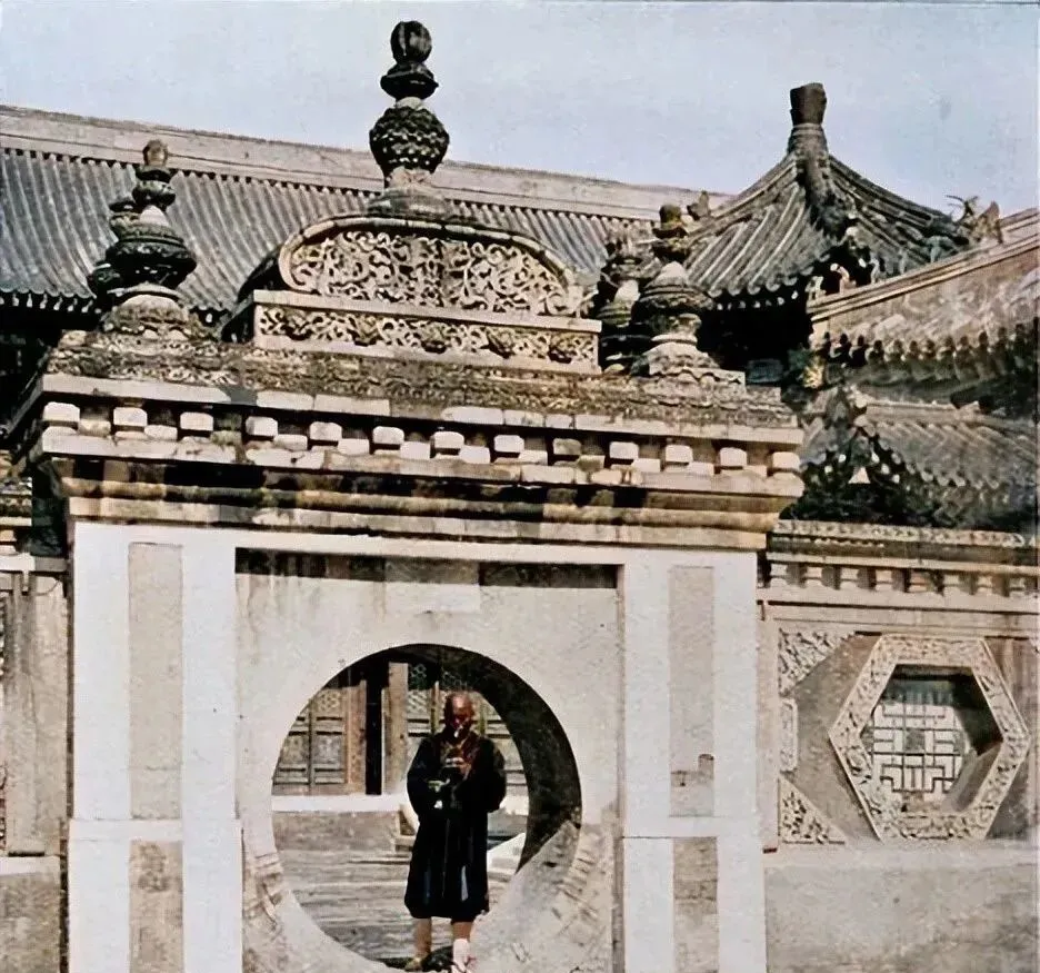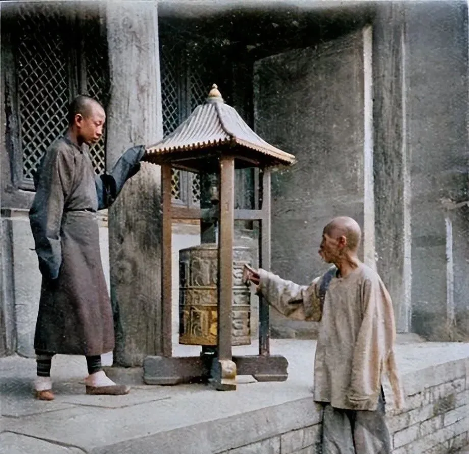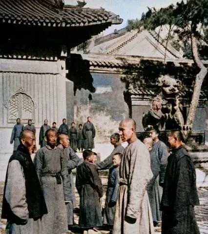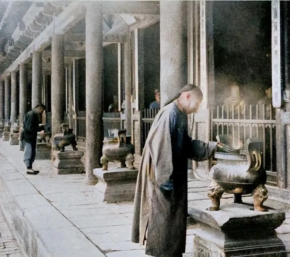 图里灰布长袍叫直裰,香客三三两两站在殿前,院里狮子蹲着,庑殿压得低低的,香火旺时钟鼓齐鸣,到了暮鼓晨钟,连街口卖馒头的都知道几点。