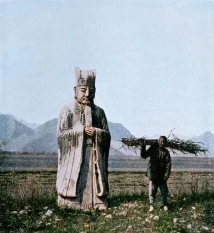这个高个儿石像叫翁仲,立在郊外神道旁,旁边挑柴的肩膀勒出一道白印,石人不语,人间只听见柴梆子磕在膝上的声儿。