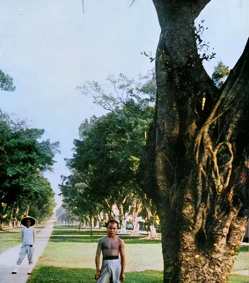 图里的笔直小路叫林荫道,一边青砖道一边草地,前头赤膊的小伙勒着布带,后面斗笠一晃一晃,那时候没空调,走阴凉就等于省半条命。
