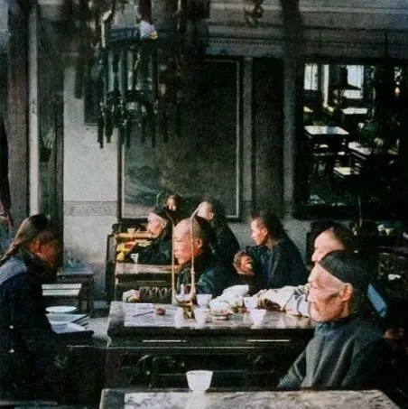 图中木楼上的招牌叫牌匾,黑底金字挂在二层栏杆外,雕花隔扇一排排,楼下长衫马褂挤在沿街廊下,跑堂端着盖碗穿梭,爷爷说那会儿喝茶不急,一盏清茶坐半天,有人谈生意,有人听书评话。