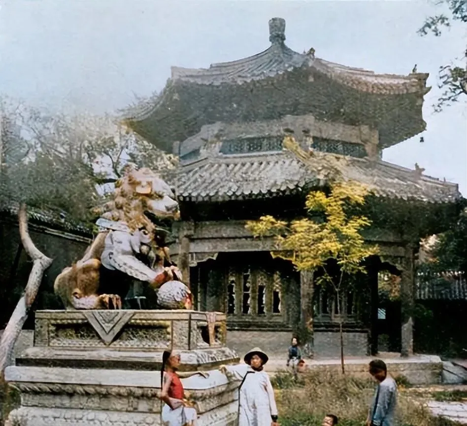 这只彩绘过的石狮子瞪着铜眼,前爪按着绣球,后面八角亭的檐子层层叠,小时候我跟着爸爸来过一回,手摸到狮身的冰凉,心里却热得慌。