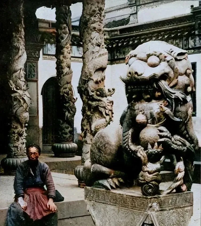 院里这几根盘龙柱是木雕贴金,龙爪勾着云头,旁边大狮子咧牙,门口坐着的老头把烟袋锅磕在台阶角上,火星一点,院子更静了。