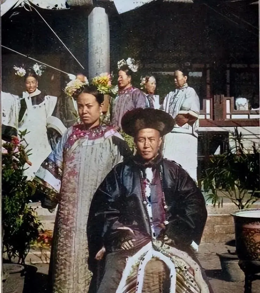 这顶大毛边的叫朝冠,身上的亮缎是旗装,薰得油光发亮,身后几个女人鬓边簪花,一脸不苟言笑,场面体面,转头也许要和家奴计较灯油钱。