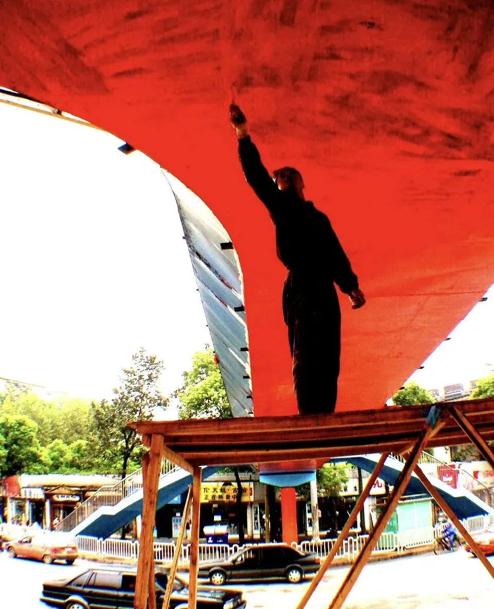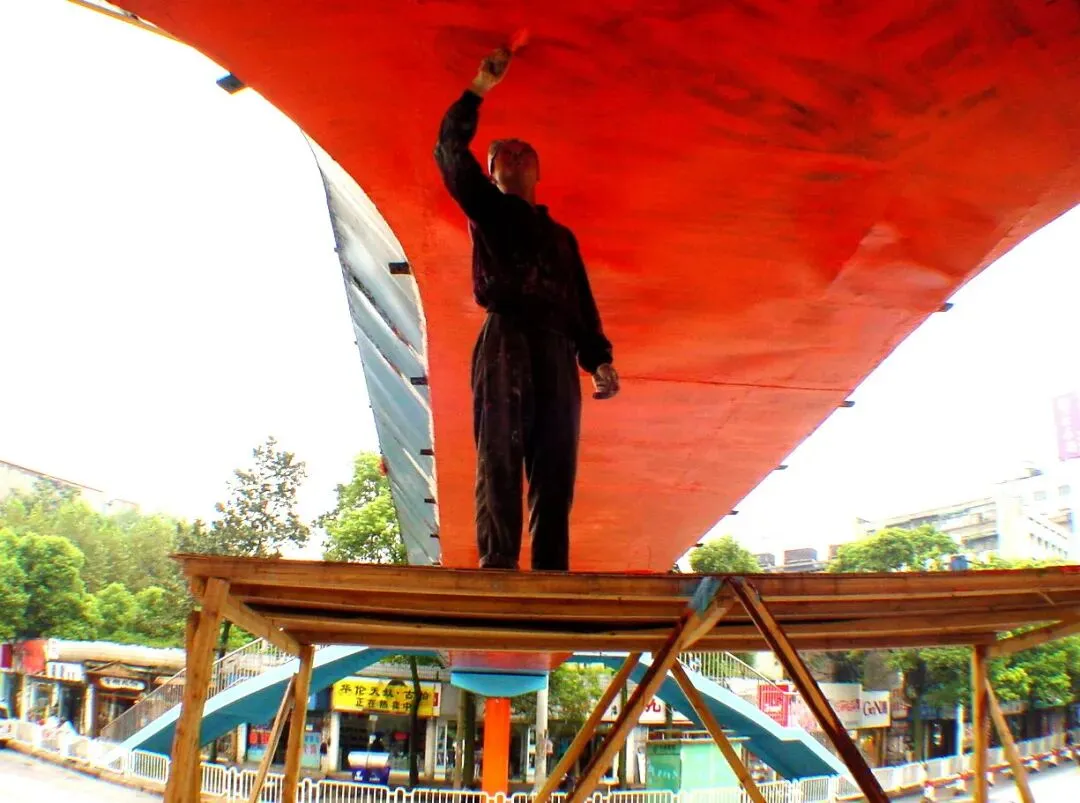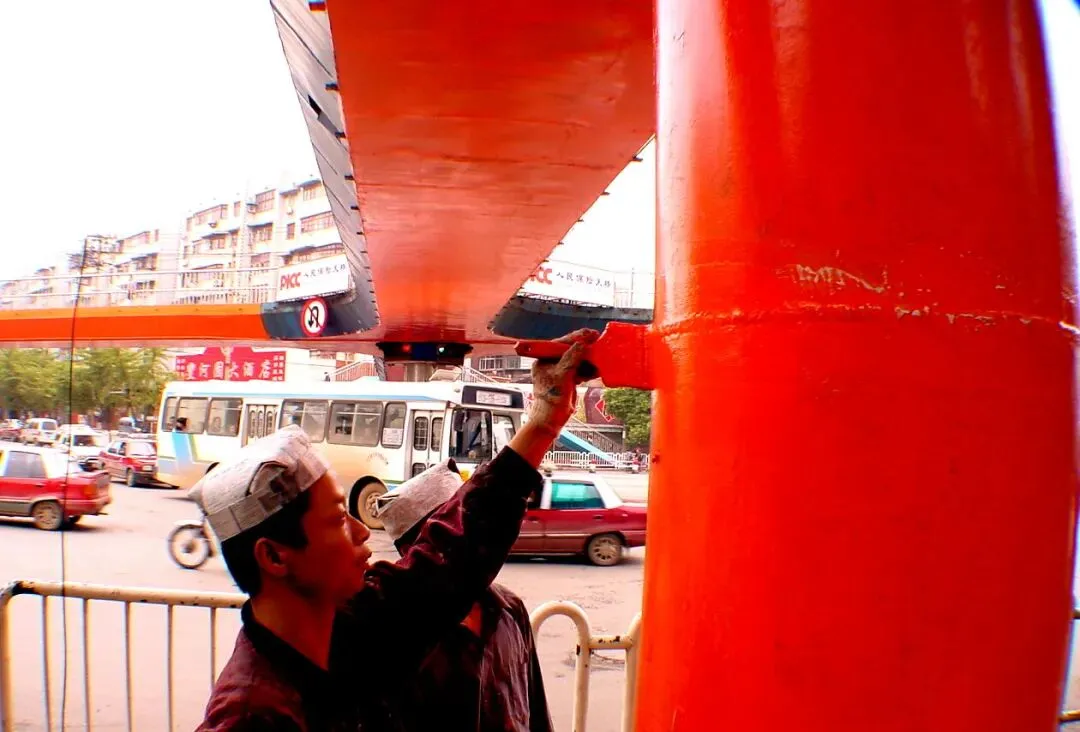 2002年9月24日,长沙八一路与韶山北路口,一名工人在给人行天桥刷油漆。