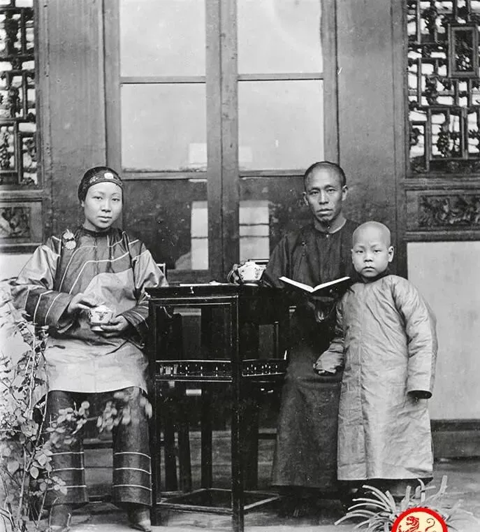 这个小桌叫供读桌,男主人翻着书,妇人捧茶,孩子站在边上,眼睛警觉又乖,奶奶看见他那神情说,小家伙是被叮嘱过别乱动,这张合影不像喜事照,更像宣誓后的留念,家里从此要按新规矩过,祭祀少了,读经多了。