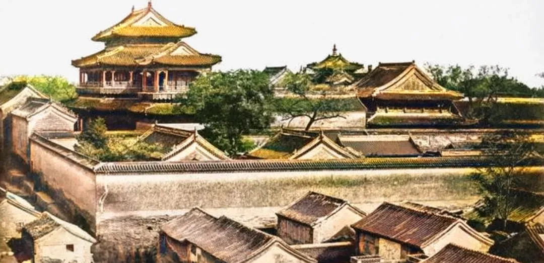 图中这处高挑的屋脊叫城楼角楼,黄琉璃顶在阳光下发闷亮,城根外是一溜灰墙灰瓦的小屋,树冠压着墙头,街上一个人影没有,老辈人说,英法联军打进来那几天,城里人都把门闩死了,锅碗也不敢敲一下,脚步声都轻着走,现在咱们嫌道上冷清都要发朋友圈求热闹,那时候的安静,是吓出来的。