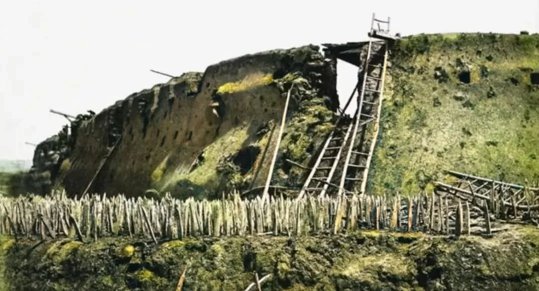 图里这排尖利木桩叫拒马,竖在壕沟前挡人马,后面那团土墙被炮弹啃出了大缺口,木梯横七竖八搭着,风一吹,草根和泥皮子一起往下掉,以前穷,用土垒城,打起来就吃亏,现在看钢筋水泥的城防,谁还信木刺能挡住远程炮火呢。