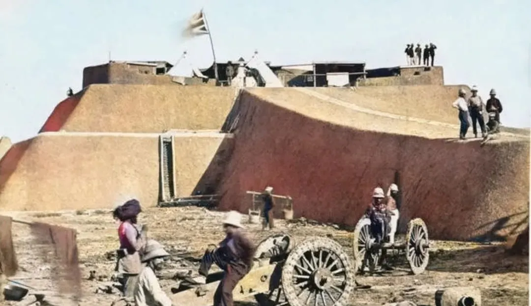 这个地势高起的几层台基叫夯土堡垒,上头插着旗,下面炮车靠着歇脚,能看见一个裹头巾的异乡兵,袖口卷得很高,动作松松垮垮,一仗以后,他们忙着修,忙着拍照,忙着打捞战利品,我们忙着收拾残砖断瓦,这种落差,不用写在书上,照片自己会说话。
