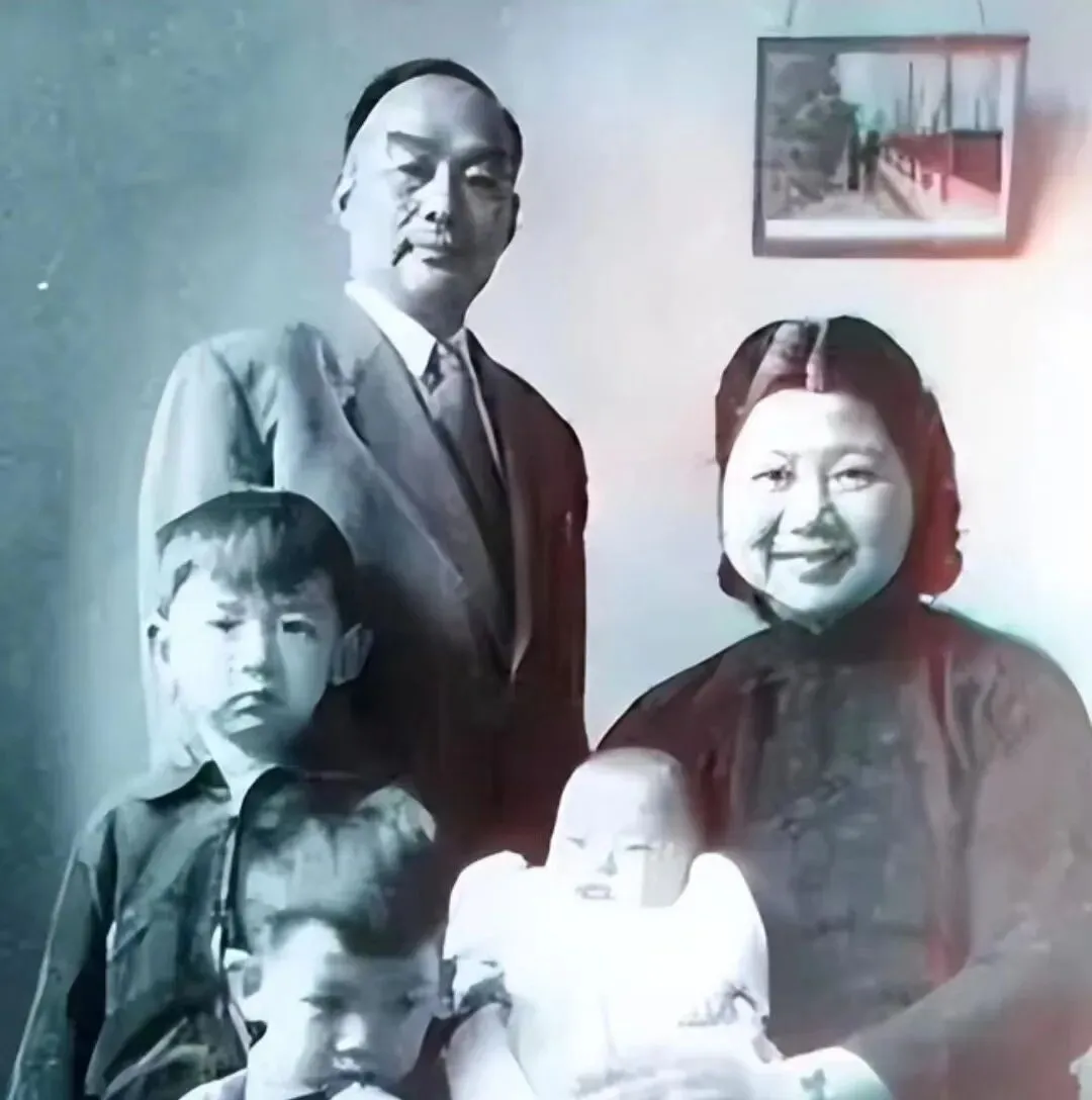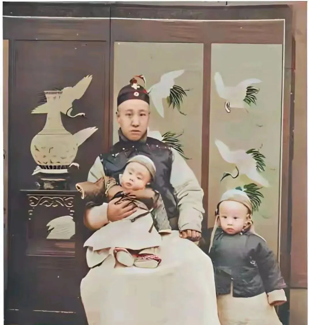 图中这身清式礼服叫袍褂,呢料里垫着棉,颜色沉着不张扬,帽顶嵌着小纽子,抱在怀里的娃脚上一双绣花鞋,鞋面微微翘起像小船一样,身后的屏风画着鹤与瓶,取**“平安”**的好彩头,这样的影楼布景那时候最流行,先生按着我们肩膀说别眨眼,等闪光一亮,全家就被按在了时间里。
