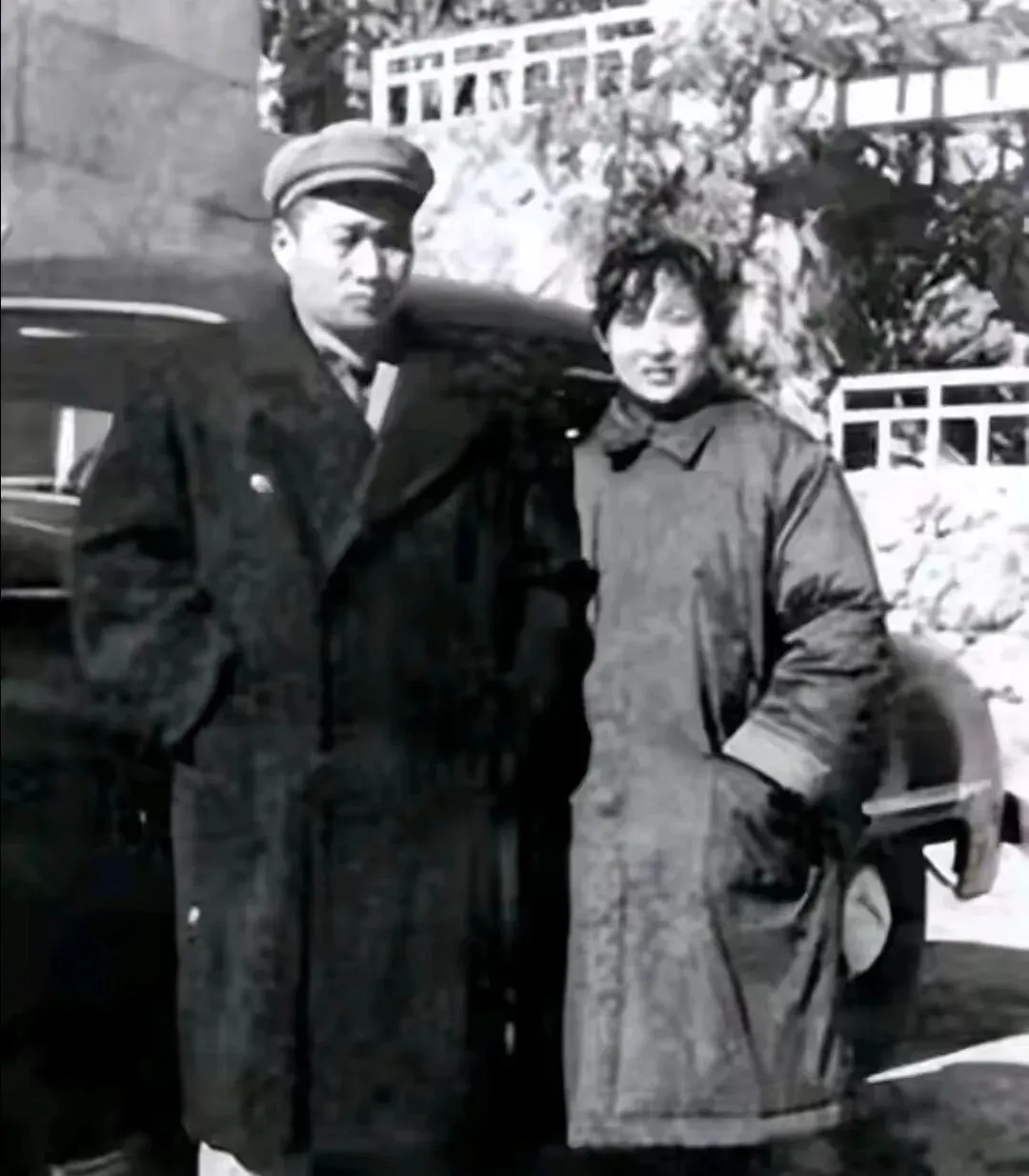 这身厚呢大衣配八角帽,旁边棉袄鼓鼓囊囊,车门像半边黑月亮,北风把人脸刮得紧紧的,爸爸看了说这是老城外的桥口,冬天出门得把围巾塞到领子里,不然风顺着缝儿往里灌,年轻人哪懂这个门道。