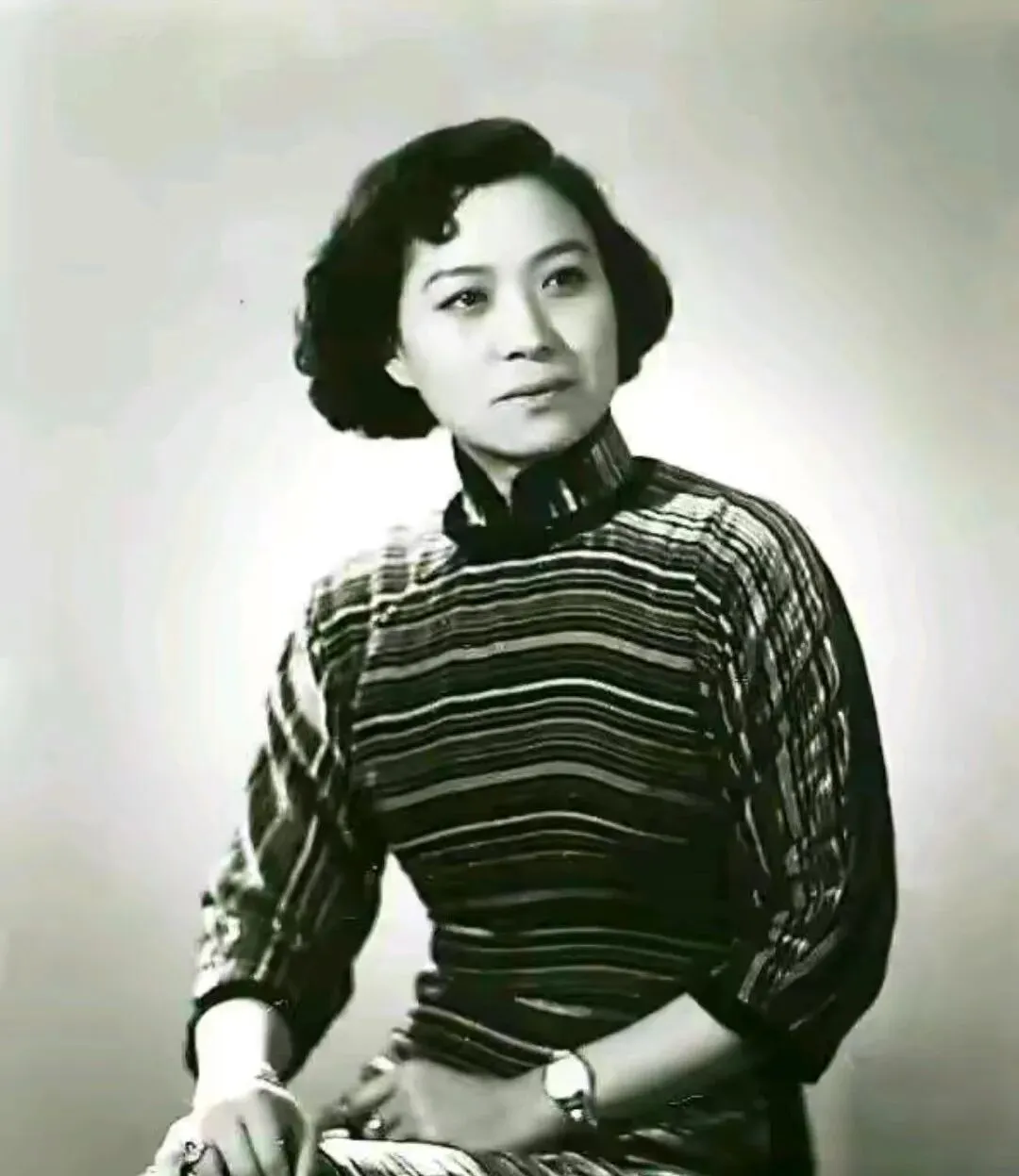 这张单人坐像里,条纹旗袍把腰身收得妥帖,短发烫成内扣,手腕上一块细细的表,目光往旁边看过去,像在想答案,影室的冷光把布景打得干干净净,人物就更显得精神,一张好肖像,靠的是坐稳与不乱想笑。