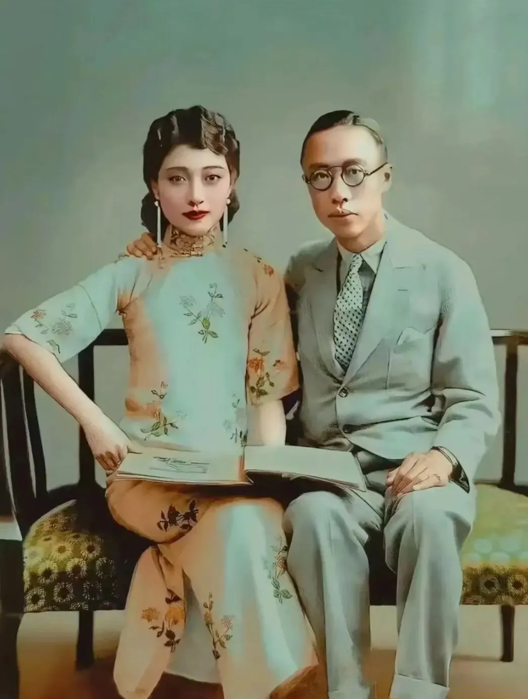 图中这对捧着册子的叫读书照,男士金丝眼镜,灰色西装熨得一条线,女士的绣花旗袍底色温润,耳垂上的长坠子轻轻晃,书翻到中间,像要读给彼此听,家里旧相册也有一张类似的,我爸说那会儿恋爱最会找借口,看书就是最体面的借口。