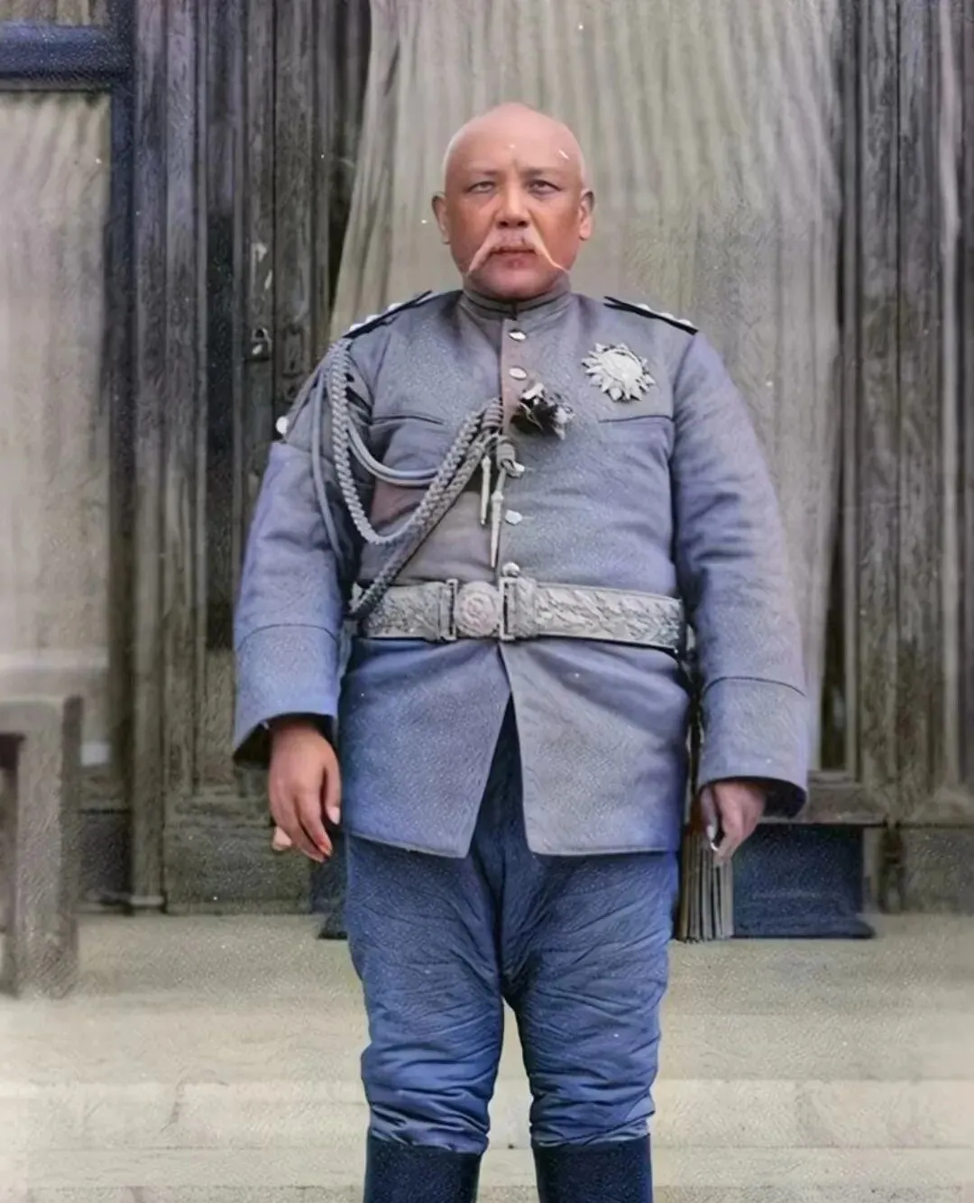 这身戎装硬朗得很,肩章扣得一颗不歪,胸前章带像一朵铁做的花,靴筒裹到小腿,站在台阶上像堵墙,摄影师多半是蹲下来仰拍的,这一仰,气势就被往上托了三分。