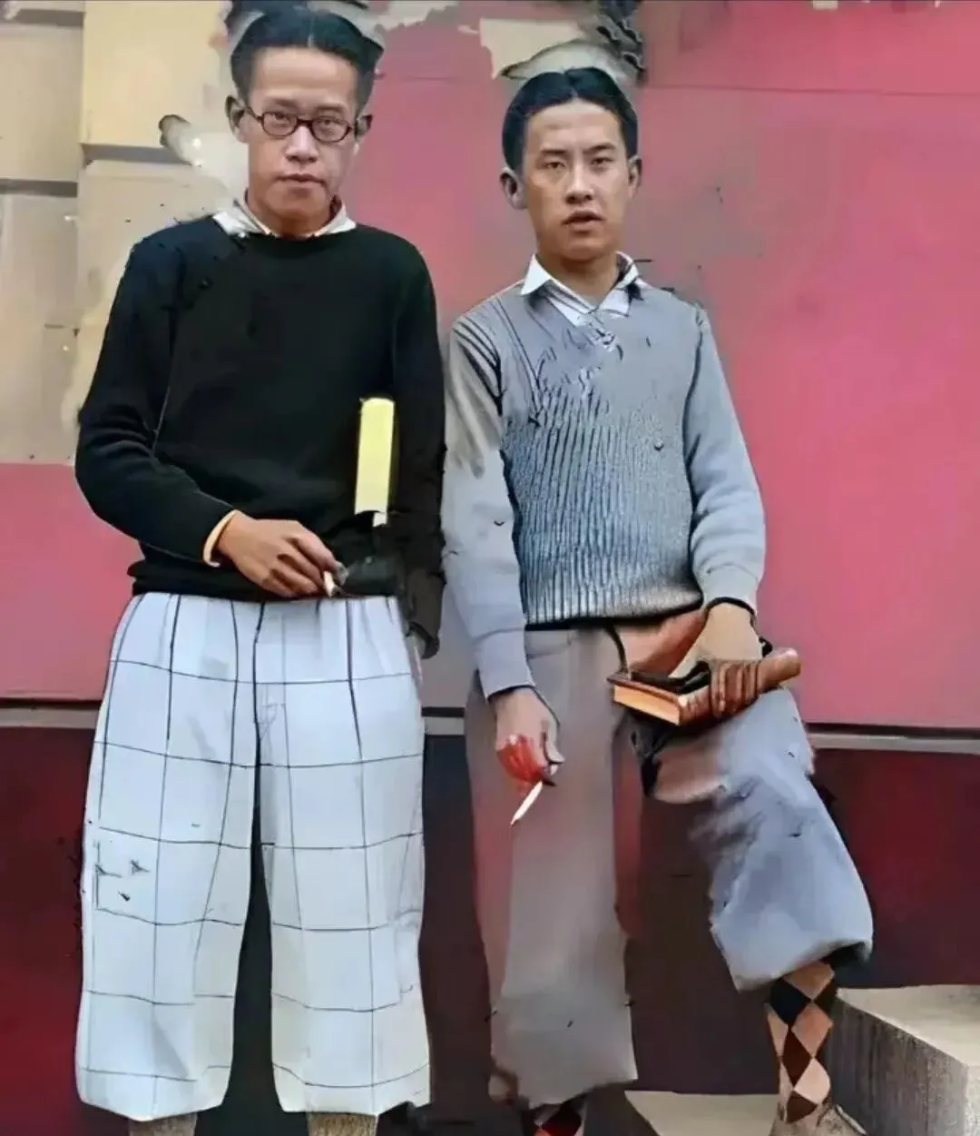 看这两位的裤脚,方格、罗纹、加上菱形长袜,一身洋气,手里各捏着书和烟,墙被涂成火一样的红,像从课堂上逃出来的风,叔叔笑着说那会儿谁不学明星站姿,脚一搭,肩一斜,照片就活起来。
