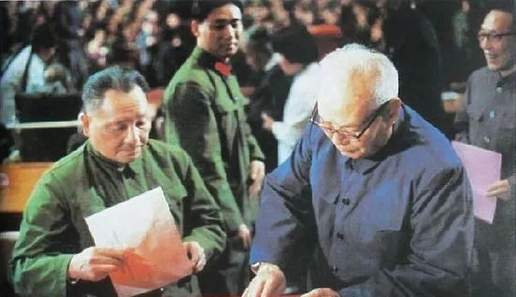 这幅靠着红色墙面,后头有国徽模样的装饰,胸前口袋扣子紧得很,眼神偏一点点,像是会场间隙被叫去按下快门,站也不是坐也不是,端着身子不肯松。