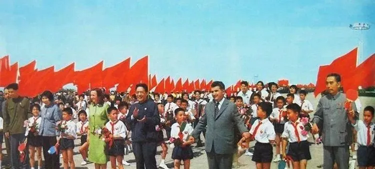 这一张场面更亮堂,红旗排成海,孩子们系着红领巾牵着客人的手,笑得眼睛都眯起来,风把旗子吹得猎猎作响,远处的扩音喇叭像在喊欢迎词,画面里全是鼓掌的掌心和花束。