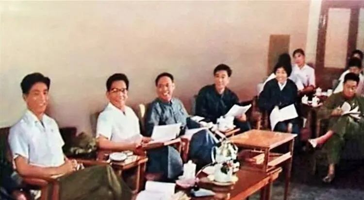 茶几上摆着搪瓷壶和玻璃杯,几个人拿着纸笑出声,椅背罩着小方格布,屋里像点着白炽灯,光线一晃一晃,谈笑间的轻松反倒把紧绷的时代气息冲淡了点。