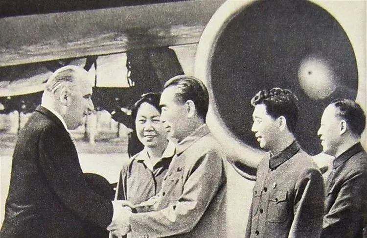 这个是机场迎宾,深呢大衣立起领口,外宾露齿笑,身旁人微微探身把手伸过去,天空很蓝很冷,风刮得人眼睛直眨,地面的影子斜斜地拖得老长。