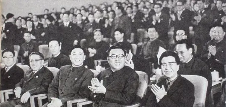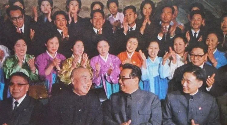 这张是文艺场合,前排人坐着说笑,身后朝鲜民族服装颜色鲜亮,掌声一波接一波,台下有人伸长脖子往前看,照相机的镁光灯偶尔一闪,把脸照得发白。