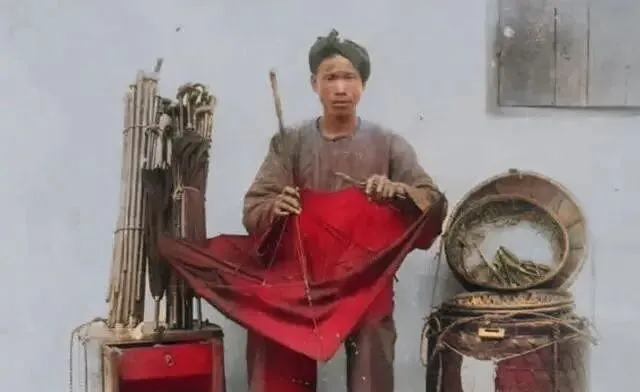 图中这摊叫修伞摊,红布是伞面翻出来晒干的样子,旁边立着一扎一扎的伞骨和细竹签,桌上常见的是麻线、兽胶、烙铁样的小烫头,师傅把破口抻平,手指一捏就找着破边的纹路,针脚挨着伞骨走,雨天一来,客人把滴水的伞往桌上一甩,师傅咬着线头抬眼一看,报价不带拖泥带水,那时候家里伞不多,坏了就来补,现在倒好,坏了直接换新的,修伞的手艺也就跟着散了。