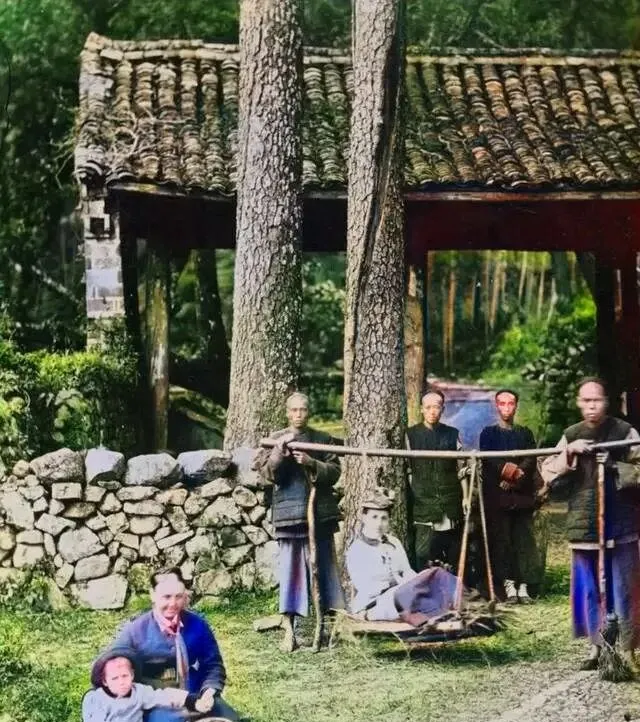 这个装置叫扁担抬架,两根杠子一横一竖,底下吊个藤编坐兜,轻便凑合,山路多的地方用得上,抬的人前后一句“备好了没”,后一个脚跟点地,前一个吸口气,架子就离地了,遇到窄桥只听木杠蹭树皮的声儿,人还得侧着肩过,现在要走这段路,早就修了水泥路或干脆开辆越野上山去了,这种简陋的巧思却有它的灵气。