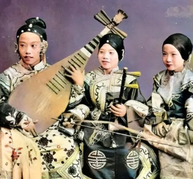 这三位小姑娘是唱做的行当,手里的家伙什一个是琵琶,一个是胡琴,还有一把小锣鼓,衣裳上压着团寿、海水江崖的纹样,发髻抹得锃亮,舞台一亮,灯油味往上一冒,她们一开腔,前门外的掌声就跟着拍起来,妈妈说早些年看堂会,戏还没开唱就有人往台口撒铜子儿图个喜气,现在孩子练琴多是考级,台下坐的是家长,热闹的味儿变了。