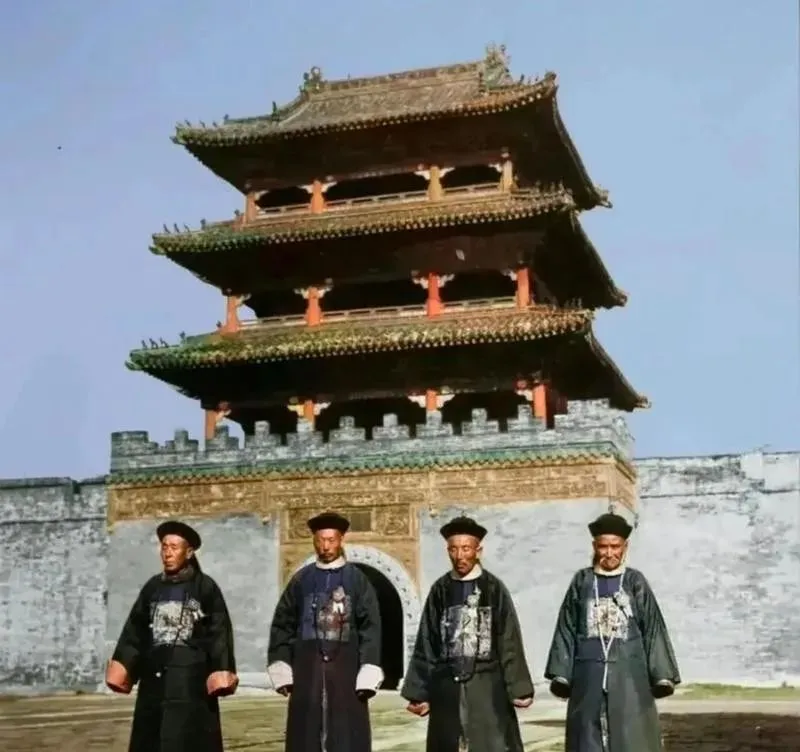 这城楼是三层歇山顶,檐牙高啄,朱柱绿琉璃瓦一层压一层,风一过,角铃细响像是有人轻咳一声,那会儿拍照不讲究摆姿势,全是站稳了不动,镜头一开一关,神情就被定住了,奶奶看见这张就笑,说你看他们衣服不算华丽,可整饬有分寸,这才像个官样。
