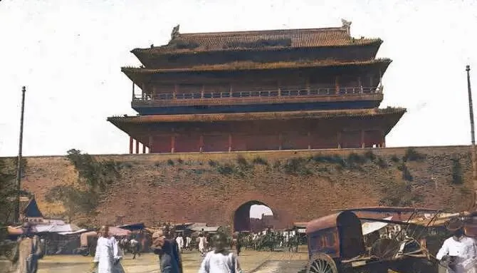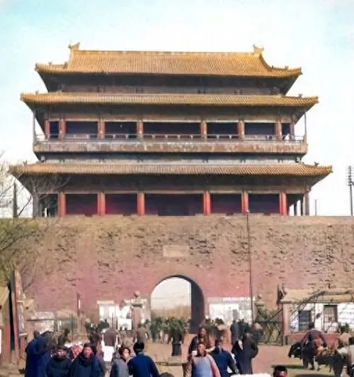 这个城门叫永定门,老辈子也叫正阳外门,砖城台厚得跟面缸一样,正中一个券洞,门洞上檐角翘起,黄色琉璃瓦压着红柱子,远远看像一摞金子被红木支着,门洞口人来人往,挑担的、赶驴车的、孩子追着跑的,热闹不输集市。