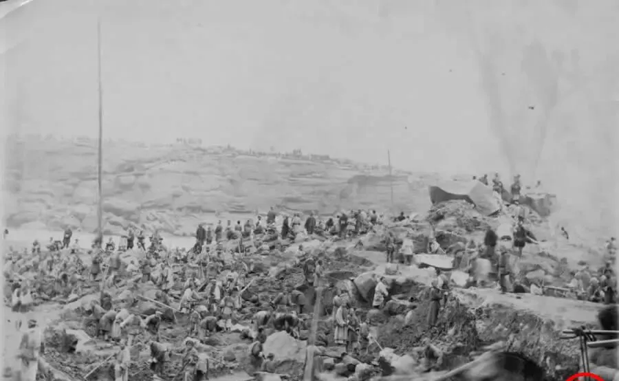 这个大场面在江边,石坡上一群人密密麻麻,锄头铁锹齐上,远处竖着折断的桅杆,说明先前有船被堵住了,工头一嗓子喊开,众人抡起臂膀敲石开沟,泥水混着汗水往下淌,爷爷说遇到滑坡要抢时间,不然涨水一来,前面城里可就遭殃了,现在修防洪有机械有爆破,那会儿全靠人力硬扛。