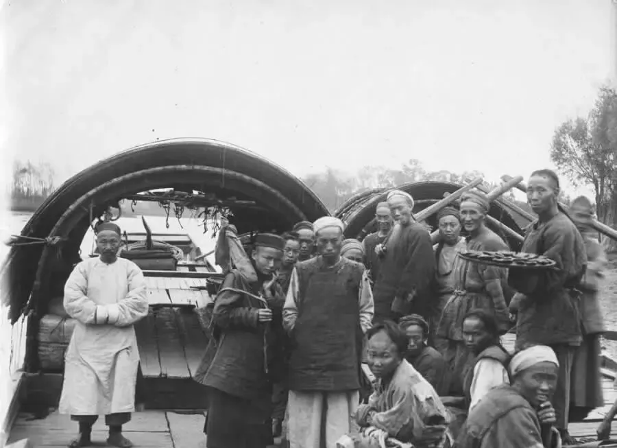 这群人围在舱口,篷棚用粗竹箍成拱,船老大站在一边没笑,眼神却镇得住场子,右侧的小伙端了只笸箩,里头是热气还没散尽的窝窝头和咸菜碟,开河季节跑一趟要靠大家齐心把纤绳往上拽,哪段急滩先过哪条船,全听他这一声招呼,现在导航一条线到目的地,当年靠的就是这张老嘴和一肚子水性。