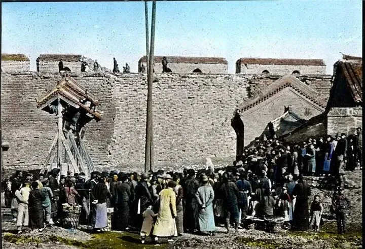 这张城墙边的热闹场面叫城门集会,人头攒动,衣摆翻飞,旗杆直杵着天,大家围着一处木台说事儿,爷爷说那会儿要传消息就得靠人喊,靠木板一敲,嘭嘭两声,巷口的人全过来了,现在一部手机,群里一吆喝,热闹在屏幕里,街上反倒安静。