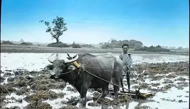 这个叫水牛犁田,犁梁乌亮,犁铧在泥里划出一条条水线,牛喘白气,人握木把,脚面被烂泥一吸一放,咕叽作响,爷爷说那时讲究趁墒劲儿,云阴压下就下地,现在拖拉机一拧钥匙,十亩地一会儿就收拾利索了。
