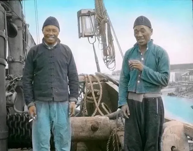 这个在码头笑着叼烟的俩人,一个手里搁着火柴盒,一个把烟夹在指缝,身后木桅横着,绳结绕了一圈又一圈,盐雾晒得他们的衣襟泛白,舅公当过船员,他说夜里看灯塔闪一次,心就落一分,现在海上有雷达有卫星,危险少了,漂泊还在,漂的人多半学会把苦笑成乐。