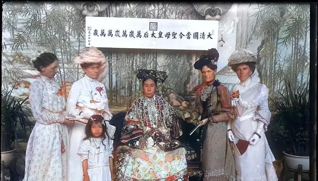 图中这场面叫合影留念,中间端坐的是位气势不小的太后模样,四周站着几位西式礼帽与泡袖长裙的女人,后头悬着横幅字迹浓重,衣摆与花朵堆在身前像水波,镜头一按,旧朝的礼数就和洋场的新式打扮撞在一块了。