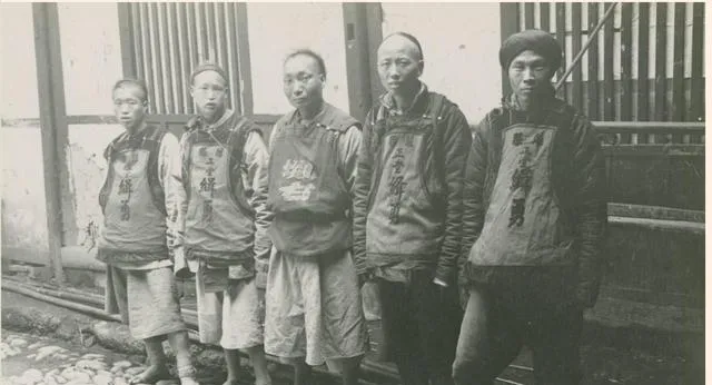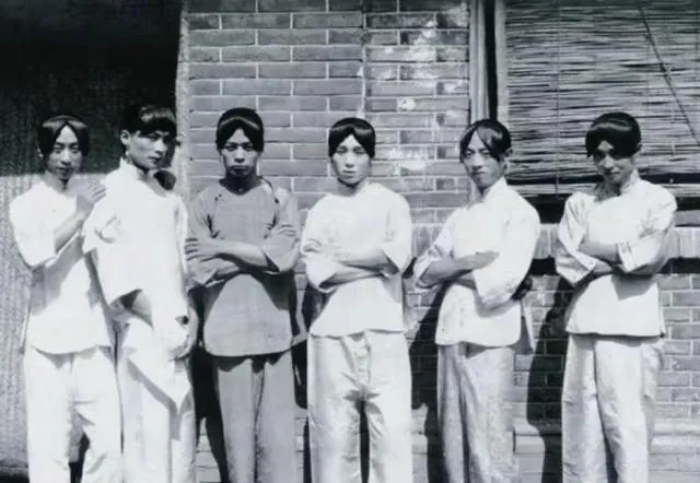 这群小伙穿素衣立在青砖墙前,眼角压着一股子倔劲,胳膊抱在胸前不笑也不闹,发髻贴得服帖,站姿却不软,这一行当旧书上写得多,街口却不敢多议,照片落下反倒把那年月的尴尬和生计都照实了。