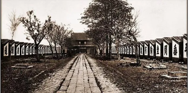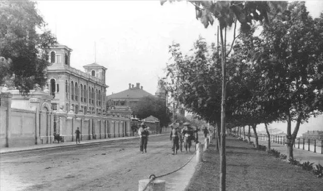 这里是一段租界路,一边是洋式立面与围墙,一边是行人挑担缓慢走,树荫把路影子切碎,远处河岸安安静静,隔一堵墙就是两种日子,这种并排走的感觉在老照片里最明显。
