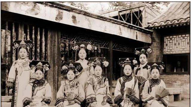这几位打扮讲究,旗头宽大,边角镶着花枝与珠穗,站在廊下背后是斑驳的木壁,妆容匀白,手里扇面折得齐,表情却有点拘着,奶奶看见这张常说一句,旧宫里人多规矩也多,笑都得分时候。