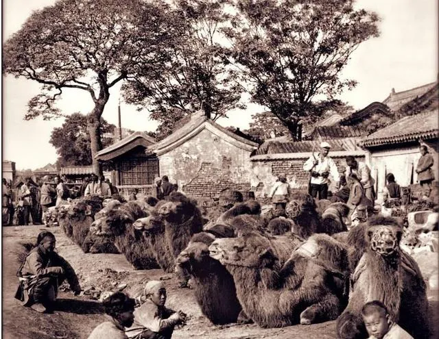 这里是骆驼市口,一群毛色发黄的大个儿卧成一排,缰绳拴在一起,驼背鼓起像一溜土丘,旁边孩子蹲着抠泥,赶骆驼的男人举手就能把绳子扬起来,那时候进货靠它们走胡同穿城门,可耐走可吃苦。